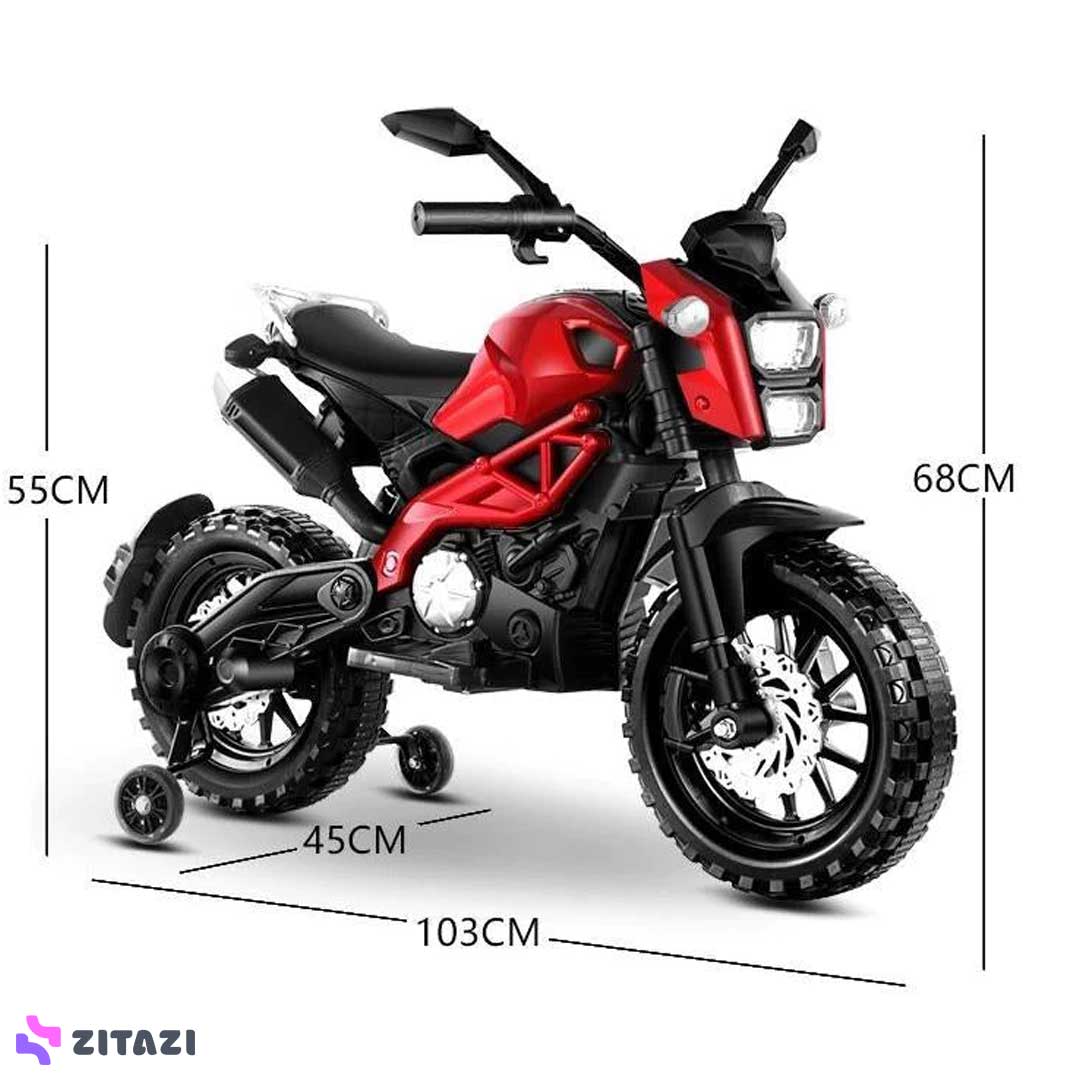 موتور شارژی دو موتور دو سرعت باتری ۱۲ ولت-صندلی چرم موزیکال استارت دکمه ای رنگ متالیک دسته گازی تایر اسفنجی – ابعاد ۱۱۵۰۳۸۰۷۰