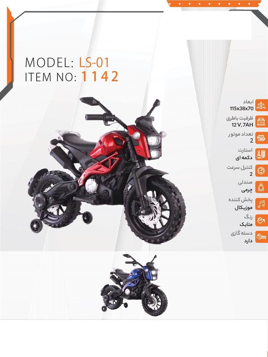 موتور شارژی دو موتور دو سرعت باتری ۱۲ ولت صندلی چرم موزیکال استارت دکمه ای رنگ متالیک دسته گازی ابعاده ۱۱۵۰۳۸۰۷